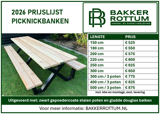 De picknicktafels worden doorlopend gemaakt, en zijn dus meestal uit voorraad leverbaar! (en anders binnen enkele dagen)