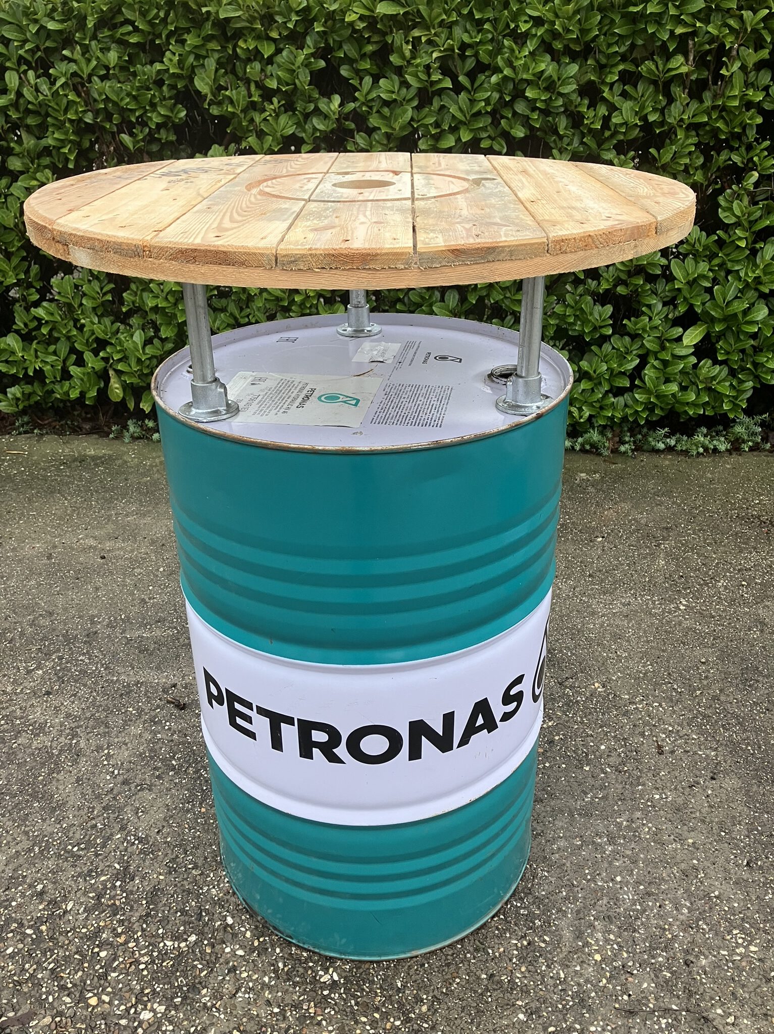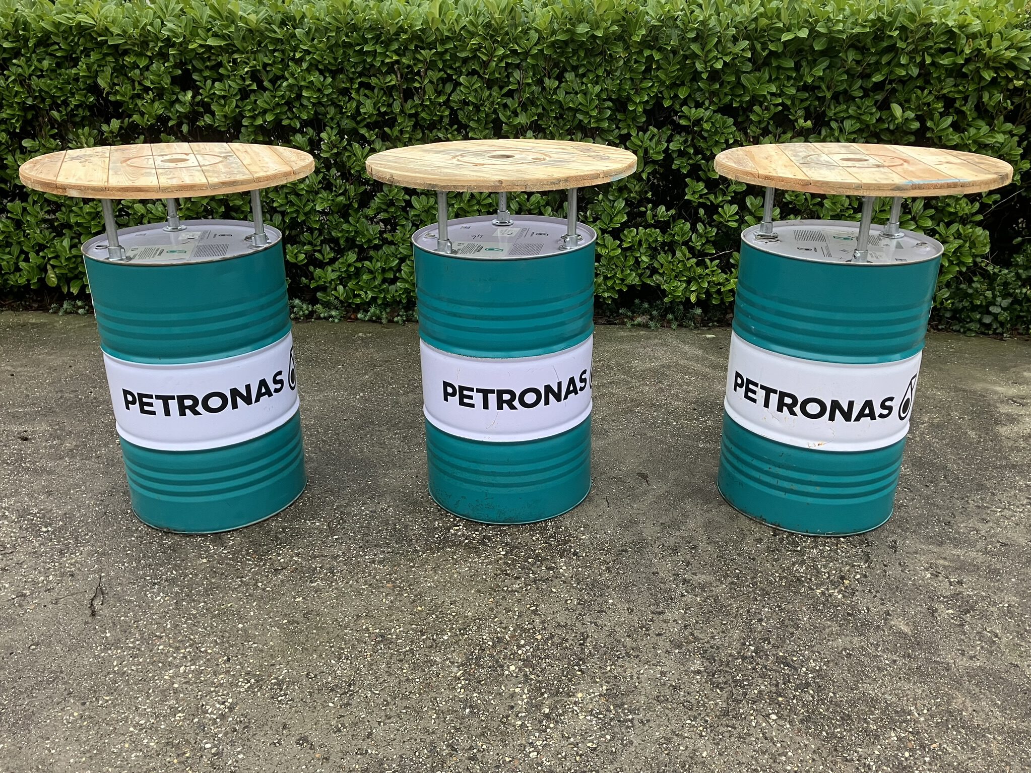 De statafels zijn gemaakt van olievaten (200L) en schijven van kabelhaspels. Deze worden verbonden door stevige, robuuste stalen steigerbuizen.